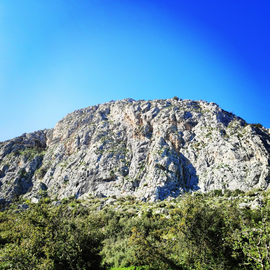 The crag is located in a quiet spot above the orchards with the olive trees, with beautiful views towards Akrocorinthos and the Corinthian Gulf. Akrocorinthos is a steep rocky hill that dominates the Corinth plain. It was the fortified citadel of ancient and medieval Corinth.