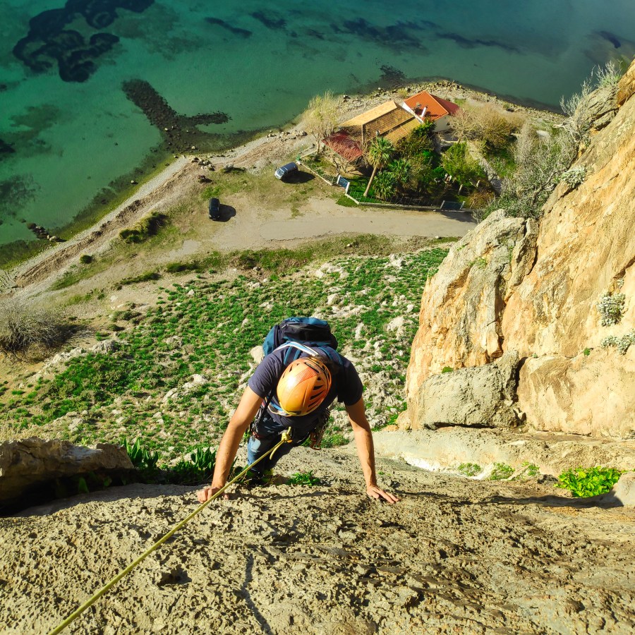Kalydonios Kapros (V+, 100 m) is 3 pitches long and partly equipped with bolts, thus the portable protection (nut, cams etc.) might be necessary. For experienced climbers, that can climb easily such grades, the bolts might be just enough, otherwise, the use of portable protection will be very helpful.