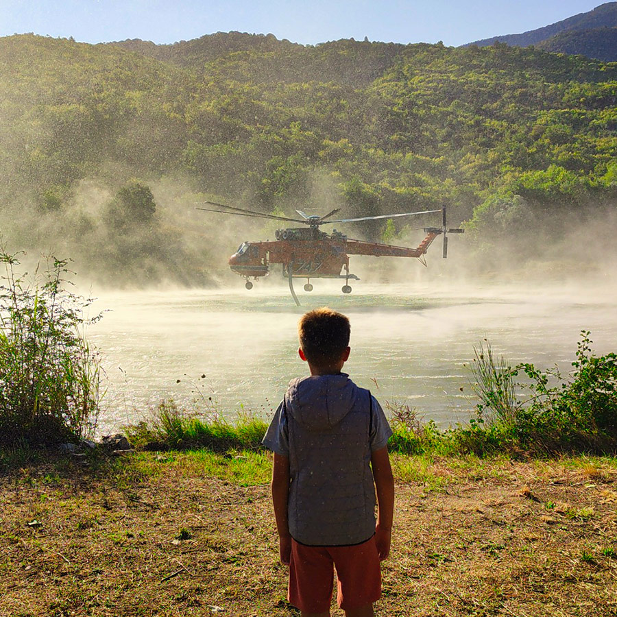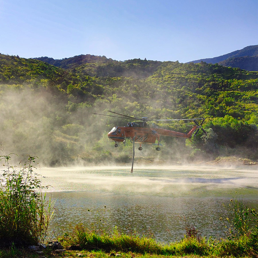 The lake’s intimate size meant we had a front-row seat to this awe-inspiring operation. The chopper hovered just above the water’s surface, its powerful rotor wash creating ripples across the lake. With surgical precision, the pilot dipped a large hose into the water, and we watched in amazement as the helicopter’s tank rapidly filled. The sight was both dramatic and captivating, a juxtaposition of the peaceful lake setting against the urgency of the firefighting effort.