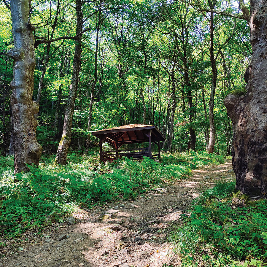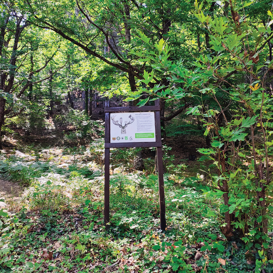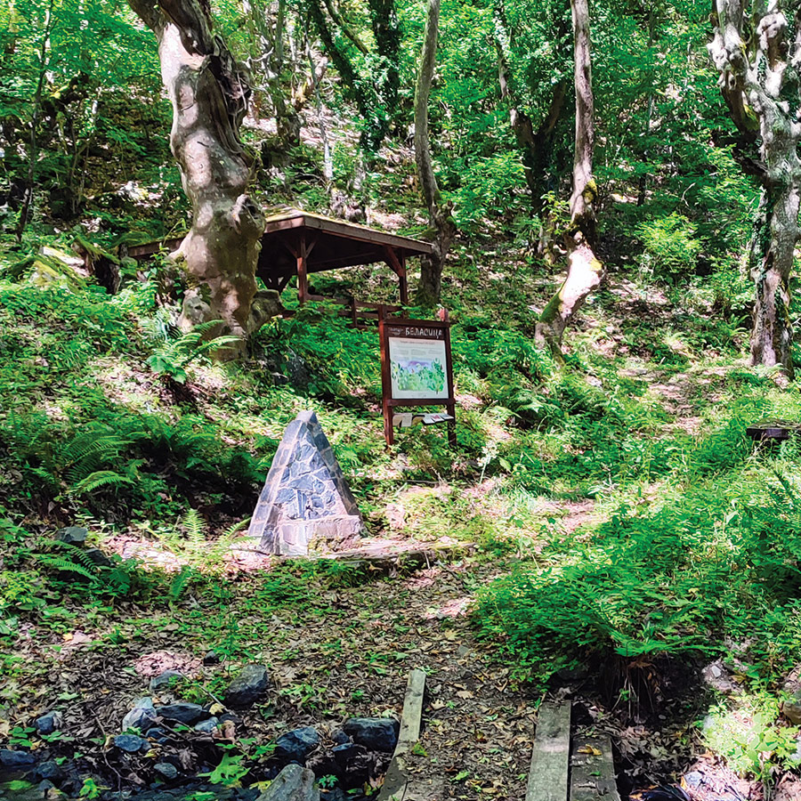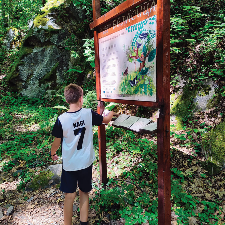 As you progress deeper into the forest, the light softens under the canopy of tall chestnut and beech trees. You’ll encounter four educational boards along the way, each dedicated to the flora and fauna of Belasitsa Nature Park. In spring and summer, wildflowers bloom in vivid colors along the path, and butterflies — true to the trail’s name, “Butterflies and Flowers of Belasitsa” — dart between blossoms, adding splashes of movement and color.