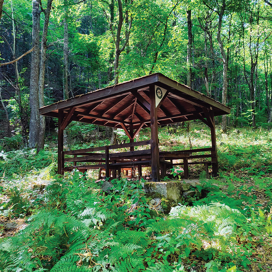 The forest here feels alive yet peaceful, and there are several wooden pavilions strategically placed along the route. These shaded resting spots, surrounded by ferns and moss-covered rocks, invite you to slow down, take a break, and enjoy a picnic or simply listen to the gentle flow of the nearby stream. One particularly picturesque pavilion sits just before a small wooden bridge, creating a scene straight out of a nature postcard.