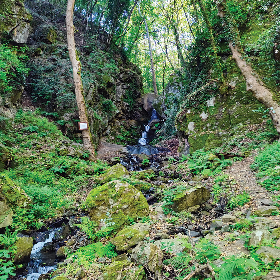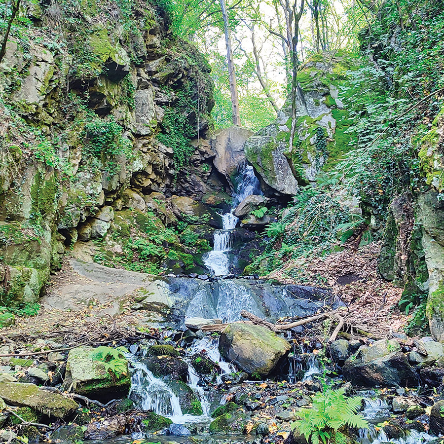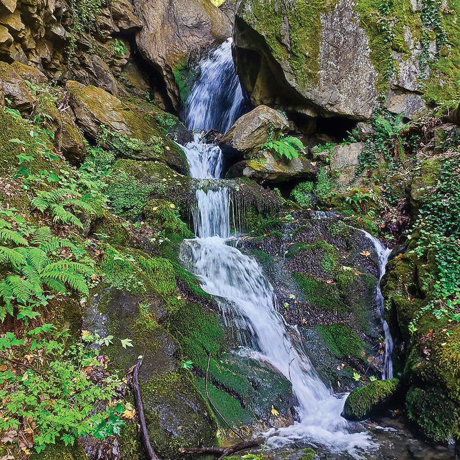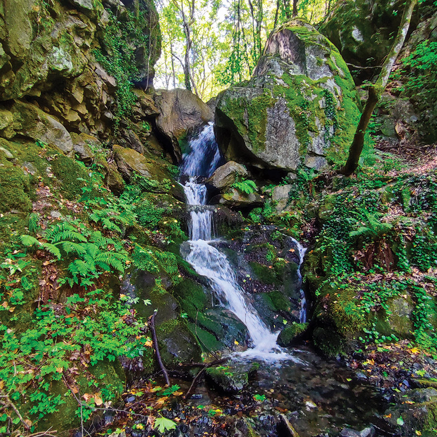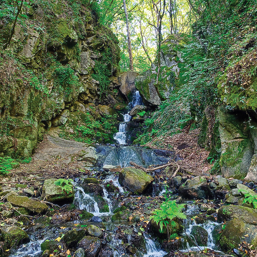The sound of rushing water grows steadily louder as the trail narrows, the stream now dancing over mossy stones beside you. Then, through a curtain of greenery, the Yavornitsa Waterfall comes into view. A slender, graceful cascade tucked between steep, rocky walls draped in ivy and ferns.