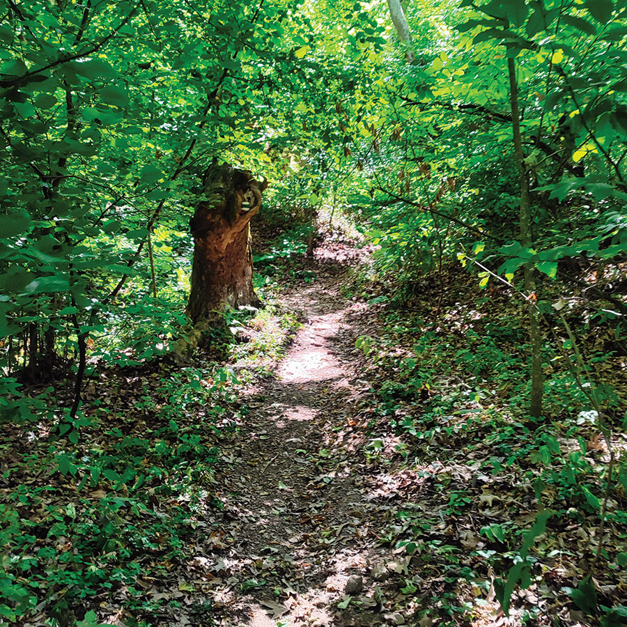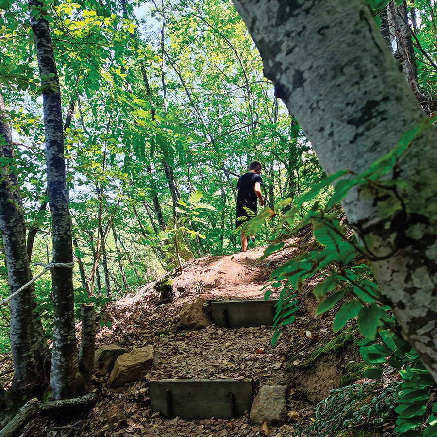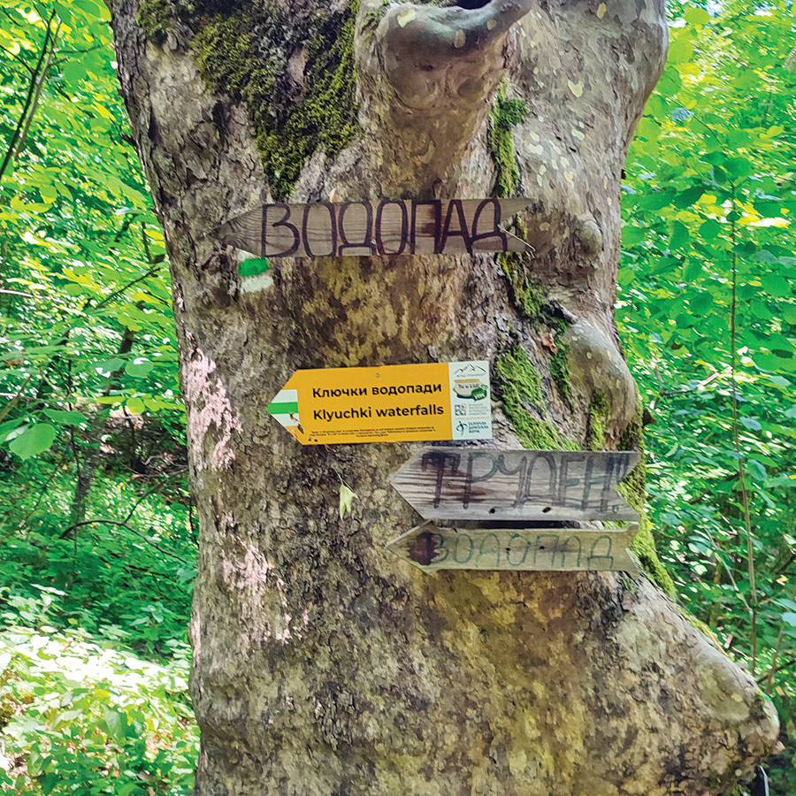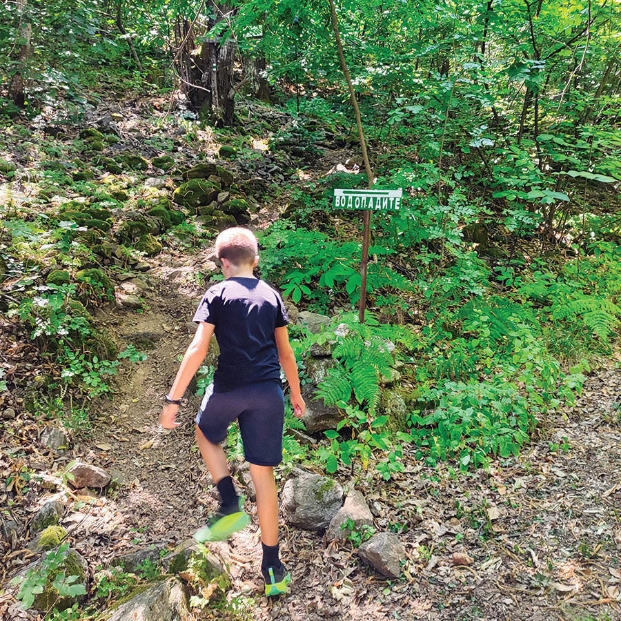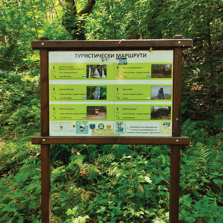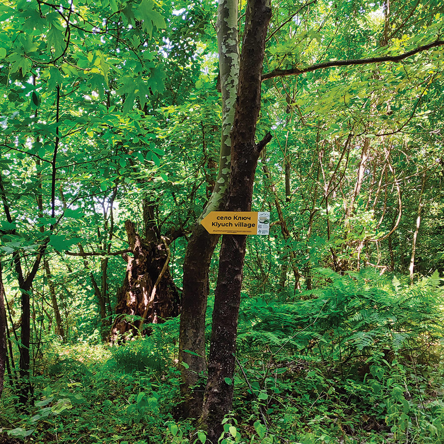 The trail begins in the lower forest, following a soft earthen path surrounded by lush vegetation. Signage in both Bulgarian and English helps guide the way, and early on you pass a marker pointing back toward Klyuch village. The first part of the hike is gentle, winding through chestnut and beech trees, the air filled with birdsong and the scent of fresh leaves.