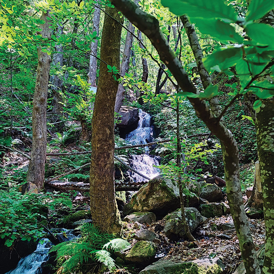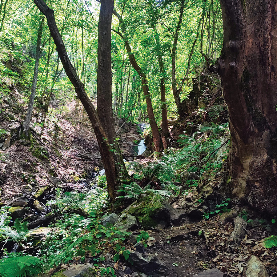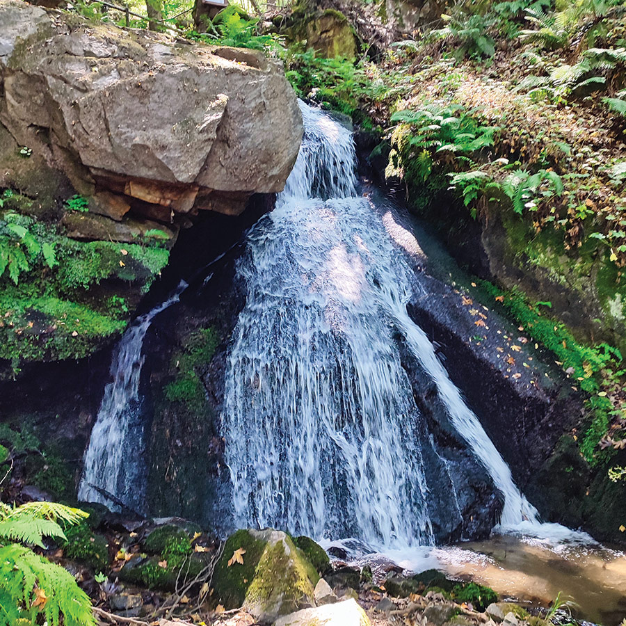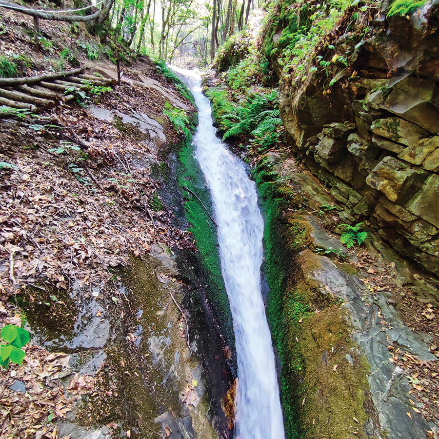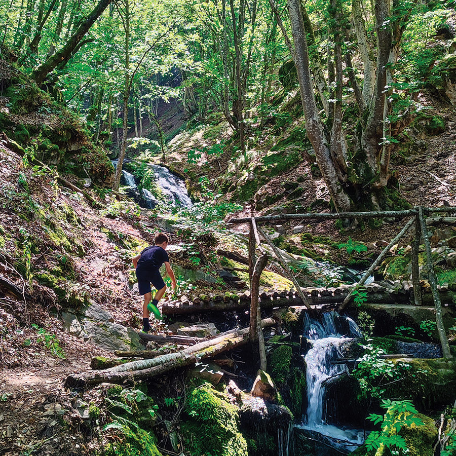 The terrain alternates between leafy ground, moss-covered rocks, and narrow passages alongside the stream. Along the way, smaller cascades provide a hint of what’s to come, each framed by ferns and bright green moss.