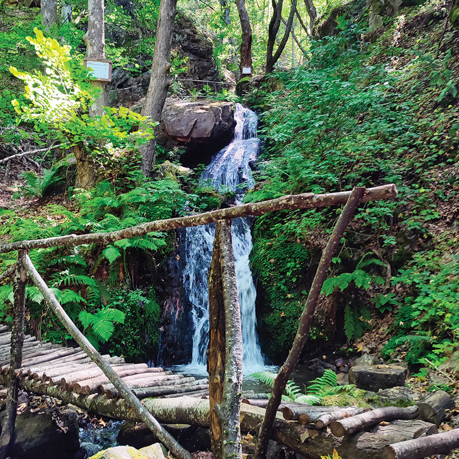 One of the most striking features is a tall, slender waterfall that tumbles into a rocky gorge, viewed from a wooden platform just above its crest. The force of the water sends a cool mist into the air, refreshing hikers before the return journey.