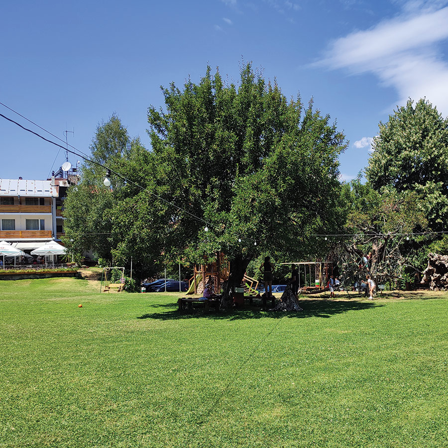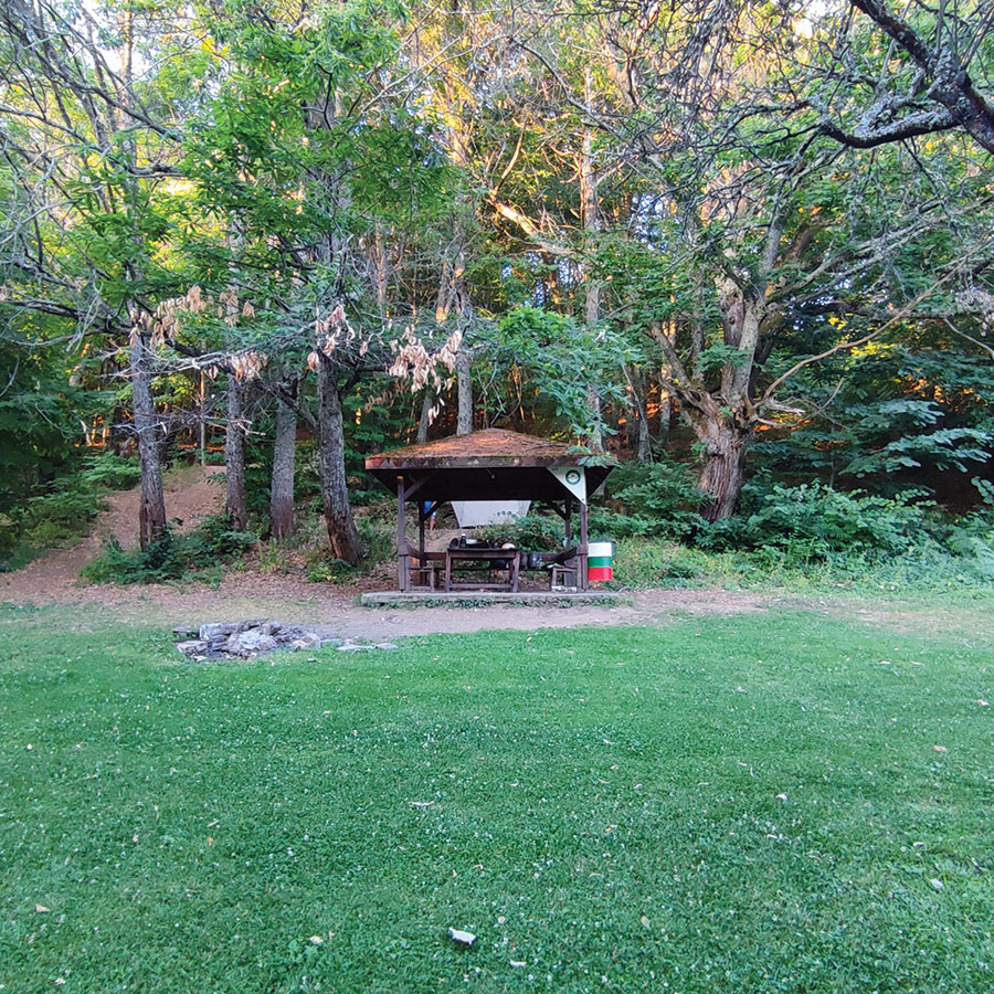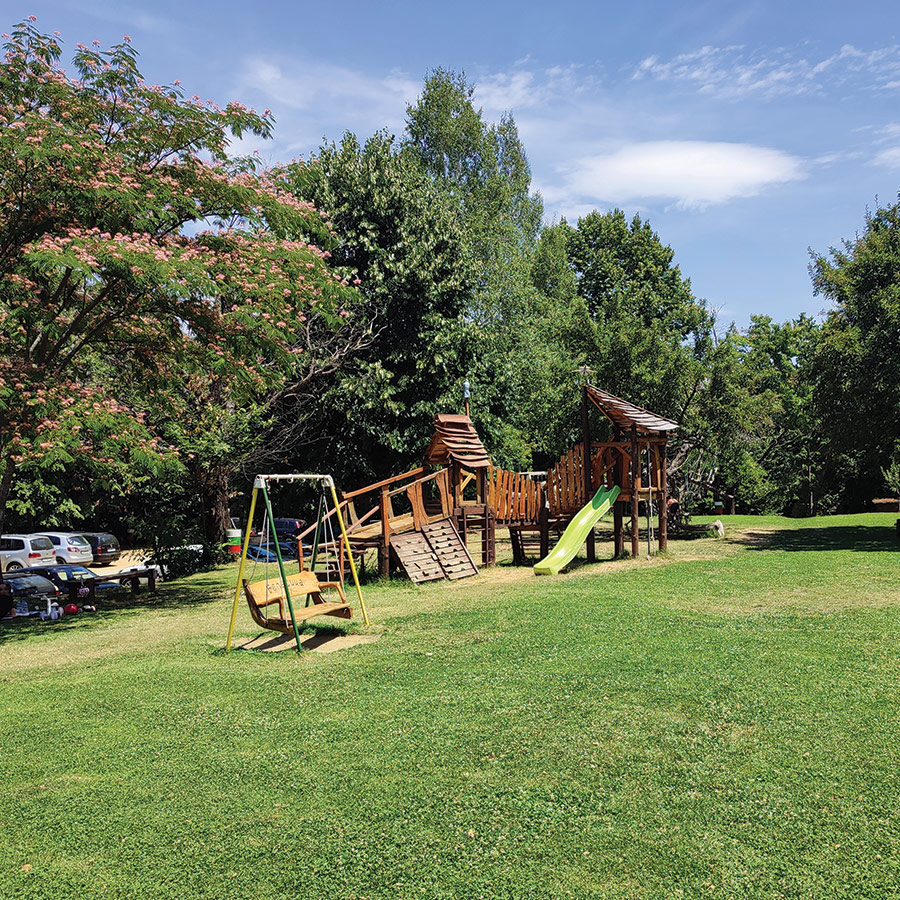 On one side, a wooden playground keeps younger visitors entertained, while a small outdoor café/restaurant serves hearty Bulgarian meals and cold drinks. Around the hut, you’ll also find shaded picnic tables, an information board about local trails, and a designated camping area for those wanting to sleep under the stars.