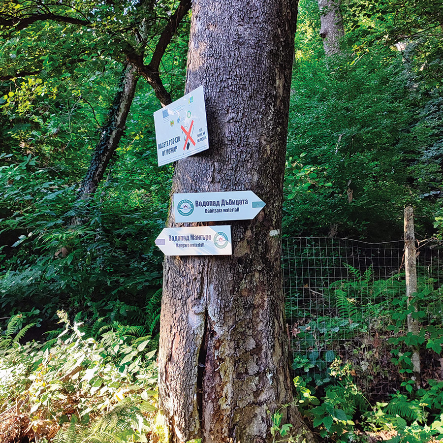 The first part of the walk winds past traditional houses, their gardens with fresh produce like peppers, tomatoes, courgettes etc., before the trail gently climbs into denser greenery. Soon, the hum of the village fades into the soft rustle of leaves and the occasional birdsong. The path, though narrow in places, is well-worn and easy to follow, with clear wooden signs in both Bulgarian and English pointing the way to Dabitsata.