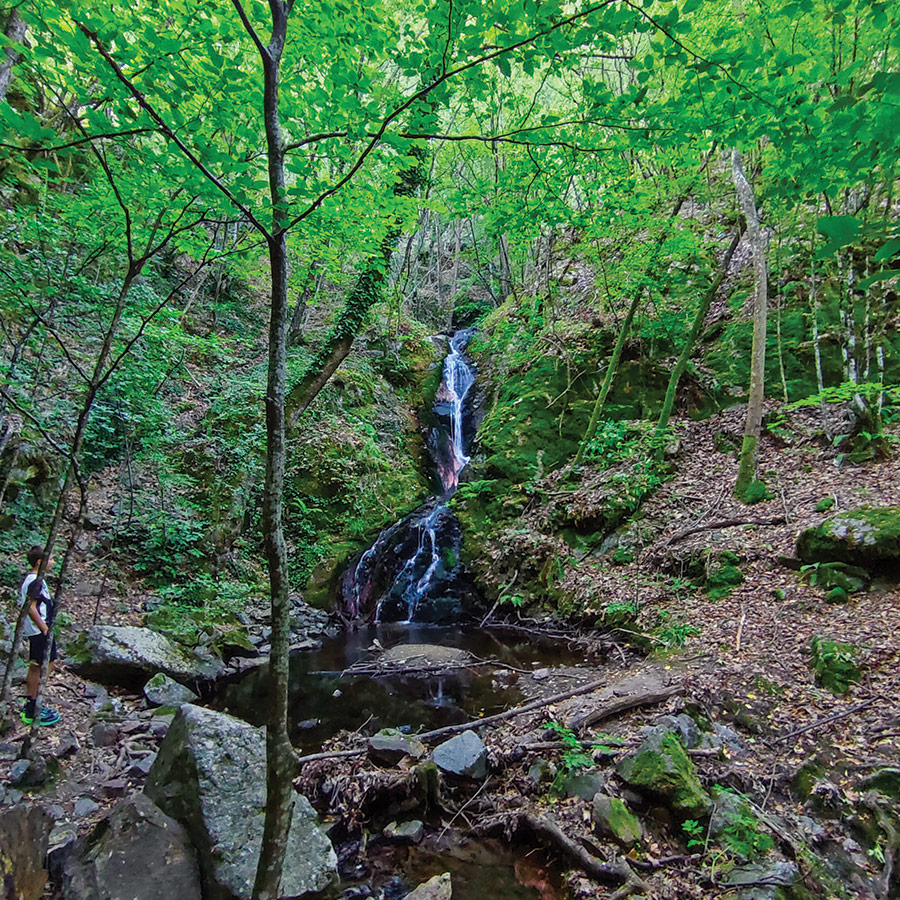 The scene feels almost magical. Steep cliffs wrapped in ivy, delicate ferns, and deep green moss create an enchanted forest atmosphere, while the cool mist from the falls refreshes weary hikers. A small flat area at the base offers the perfect place to pause, enjoy a snack, capture breathtaking photos, or simply immerse yourself in the tranquil beauty of the Belasitsa Mountains.