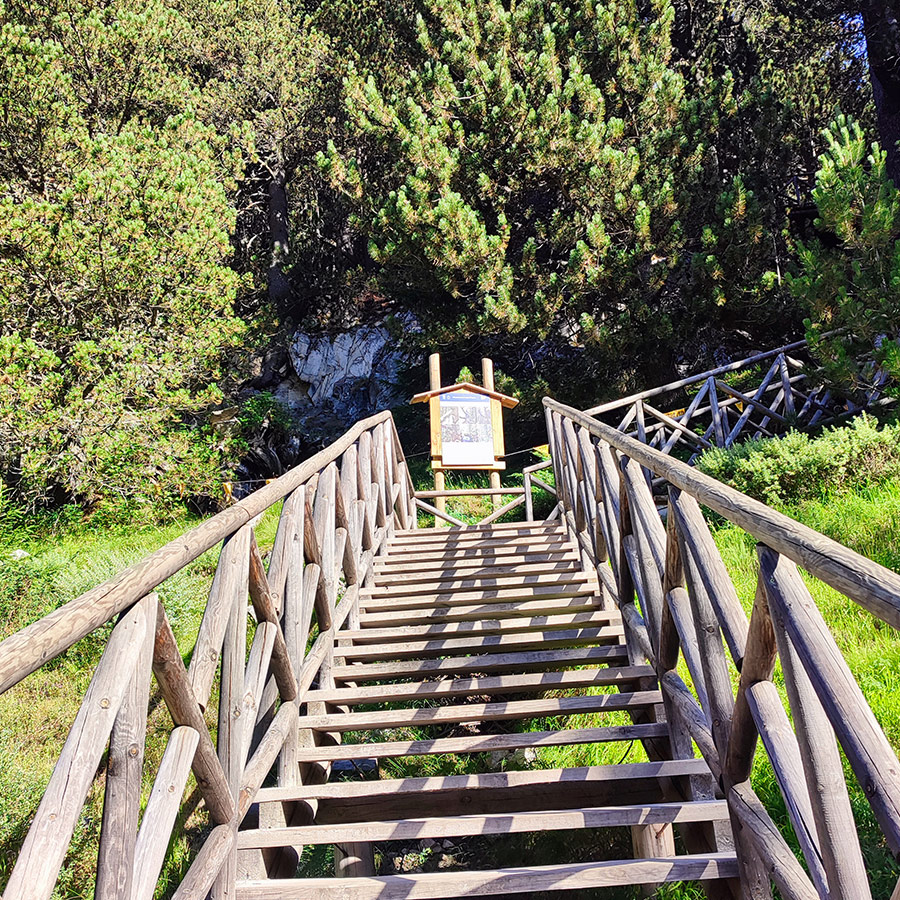Beginning the short hike to Baykusheva Mura through wooden stairways and lush Pirin greenery.