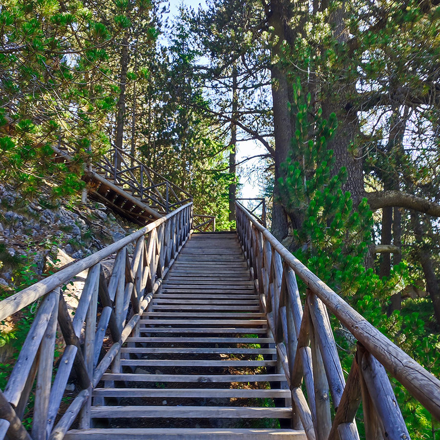 Wooden staircase trail surrounded by pine trees on the way to Baykusheva Mura near Bansko.