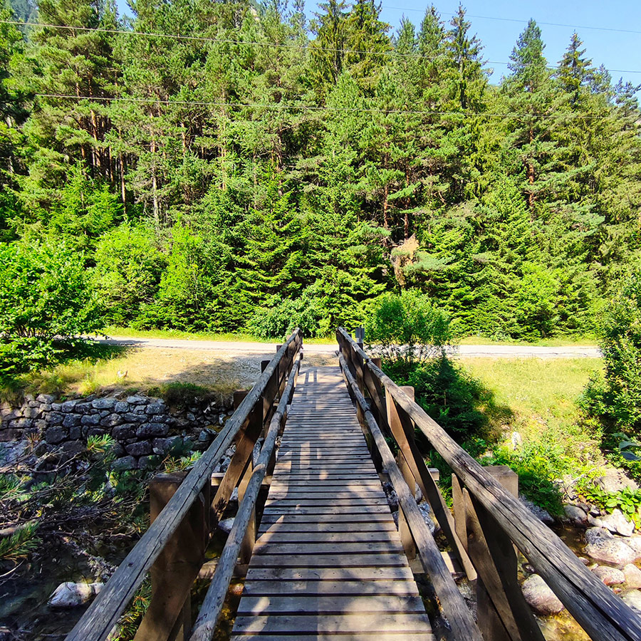Soon, the path reaches the first bridges, built in rustic wooden style and blending seamlessly with the forest. These crossings provide safe passage over the river, which flows quickly over granite rocks below. One of the most notable early crossings is Bridge No.3 “Dvata Kamuka” (The Two Stones). Its name comes from the large boulders resting in the riverbed, and pausing here gives hikers a chance to admire how the water carves its way through the valley.