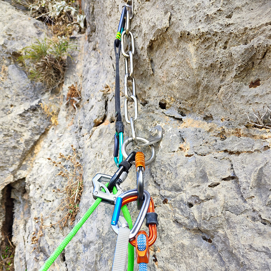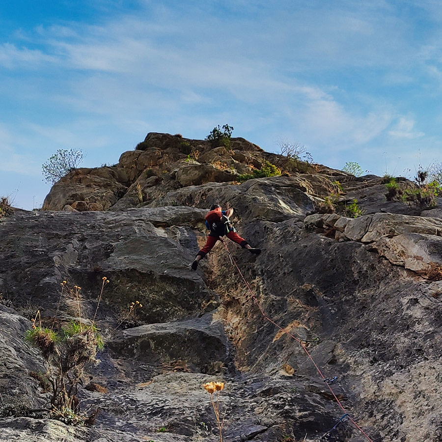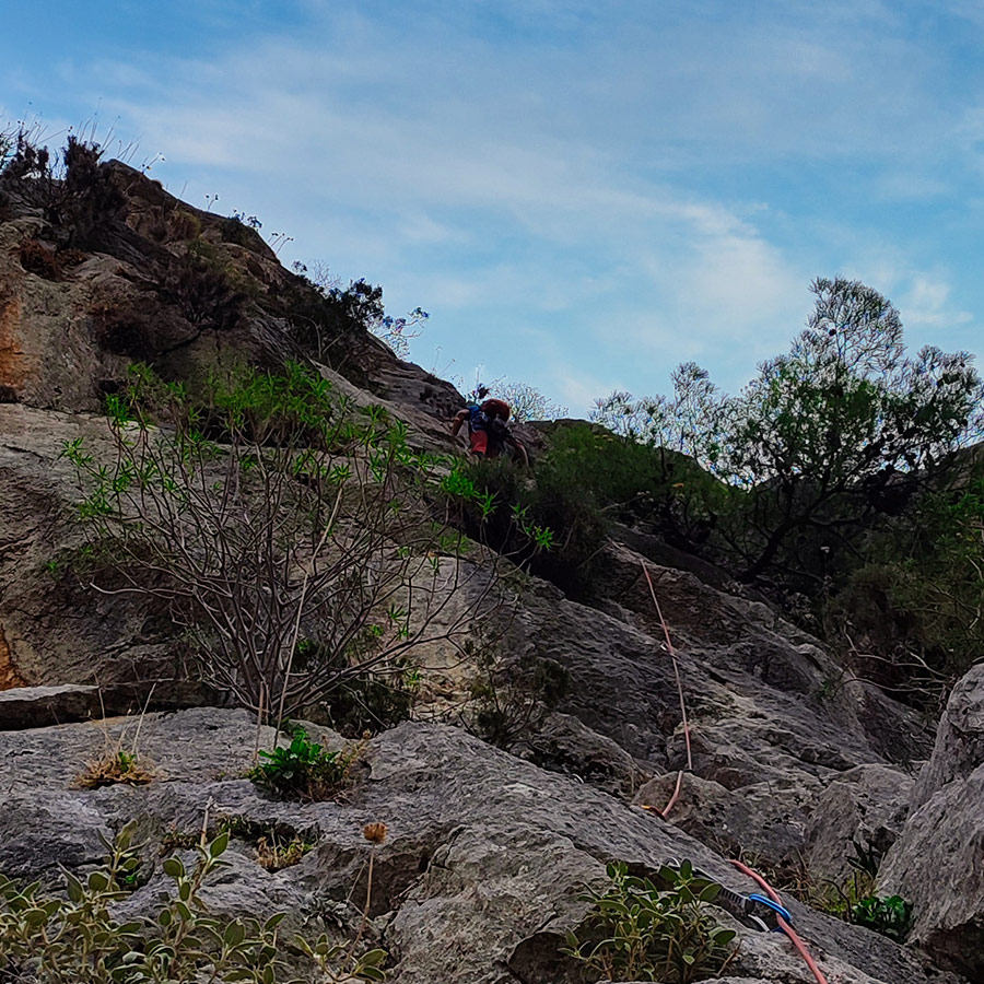 After approximately 30 meters and 14 bolts, the pitch ends at a comfortable anchor on the left, marked by two stainless steel bolts. The belay offers a secure stance and a moment to relax before tackling the higher pitches an ideal spot to regroup, hydrate, and appreciate the evolving character of the climb.